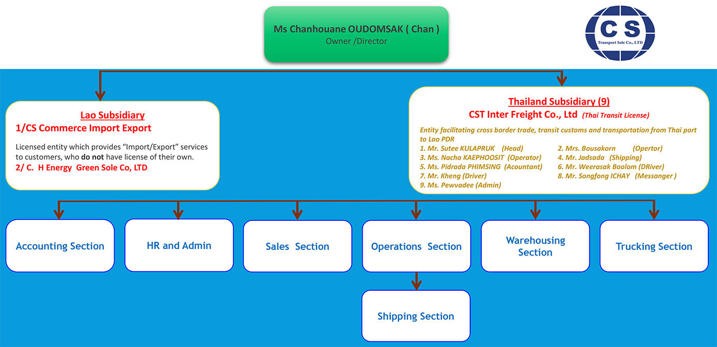 C S Transport Sole Co., LTD, was established in 2008, wholly owned by Lao Investor. The founder and owner is Ms Chanhouane OUDOMSAK. The Head Office locates at Done koy Village, Sisattanak District , Vientiane Capital Lao P.D.R.